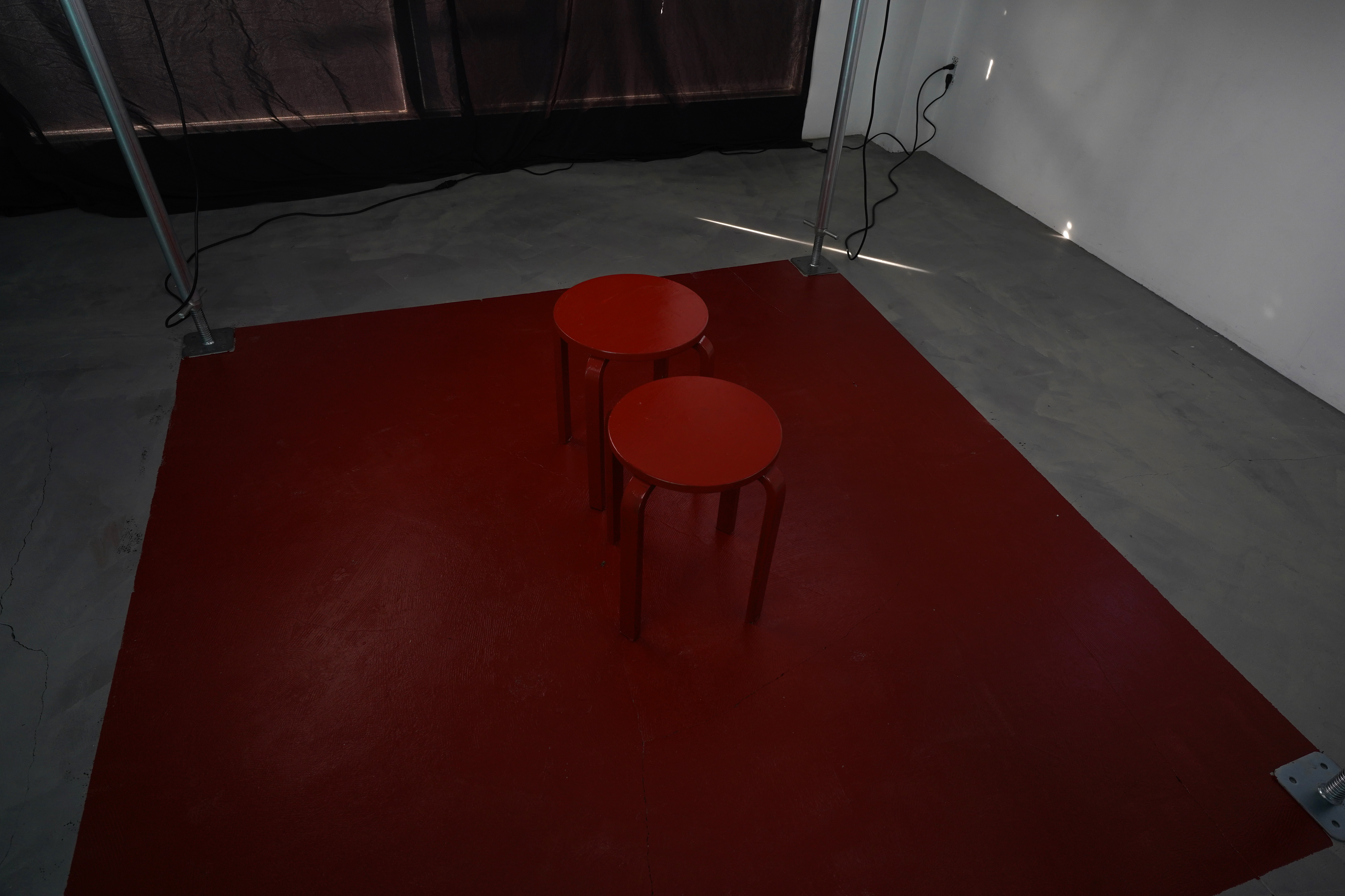 二人が模倣し演じた行為は、4つの映像作品として展開される。それらの映像に囲まれたエリアの床は赤褐色(※1)で塗られており、その中心には背を合わせた状態の椅子が二脚置かれている。鑑賞者は洞窟(※2)に見立てた赤い領域に足を踏み入れることで、他者又は内面化した自己と向き合うことになる。